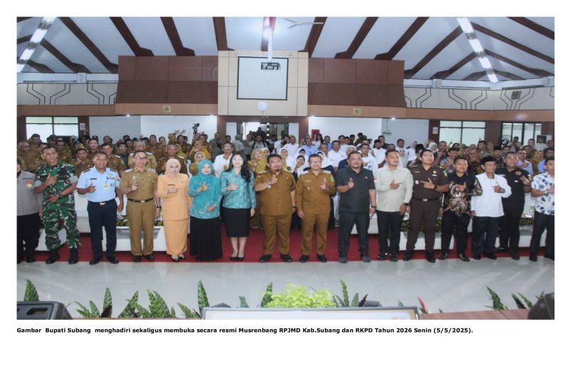 Suara Utama, Subang.- Bupati Subang Reynaldy Putra Andita B R, menghadiri sekaligus membuka secara resmi Musyawarah Perencanaan Pembangunan (Musrenbang) RPJMD Kabupaten Subang Tahun 2025–2029 dan RKPD Kabupaten Subang Tahun 2026 yang dilaksanakan di Aula Pemda Subang, Senin (5/5/2025).