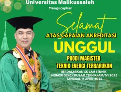 Rektor Universitas Malikussaleh, Prof. Dr. Ir. Herman Fithra, M.T., IPM., ASEAN Eng., juga menyampaikan apresiasi mendalam atas pencapaian tersebut. “Predikat ‘Unggul’ bukan hanya sekadar pengakuan atas kualitas, tetapi juga amanah untuk terus berinovasi dan berkontribusi nyata bagi pembangunan bangsa, khususnya dalam transisi energi yang berkelanjutan,” ungkapnya.