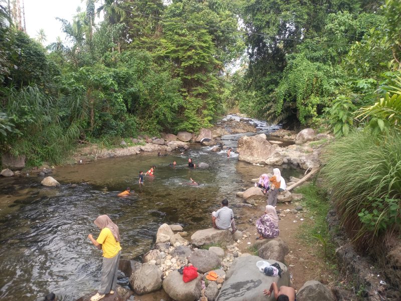 Ketika Suara Utama.Id_ mencoba menyusuri ke lokasi, “Waw…. sungguh assyik dan terkesima menyaksikan kejernihan air sungai. Serasa ingin menceburkan diri dengan sekujur badan. Namun, enggan jadinya karena tak punya kostuman untuk mandi. Kalau pun dipaksakan mencebur, yaah…, tentu akan basah kuyub jadinya dan basah-basah pulang sesudahnya. “Mending asyikan mainkan airnya yang bening saja deh, kan sudah serasa senang, hehe… !”