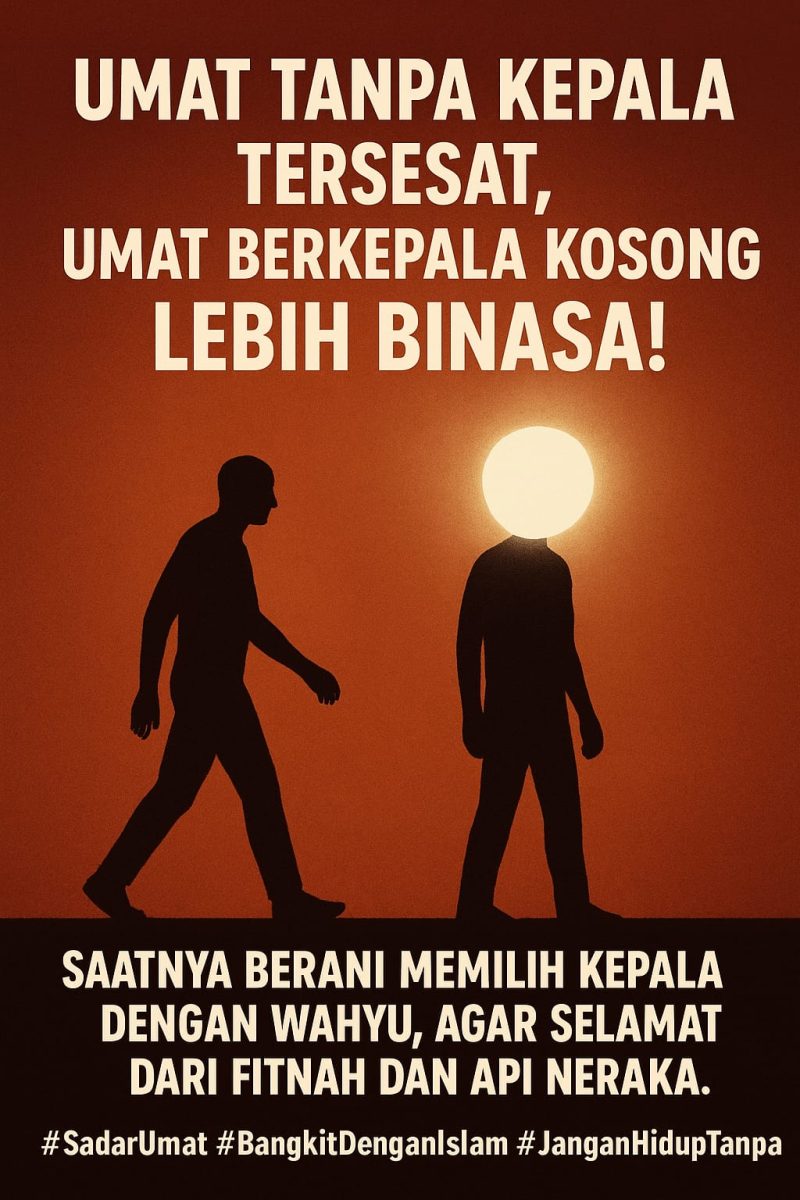 Namun, sadarkah kitaโitulah potret umat hari ini: tanpa kepala (pemimpin). Jasad besar, tapi tercerai-berai. Mudah dipecah-pecah, kehilangan kendali, berjalan tanpa arah.