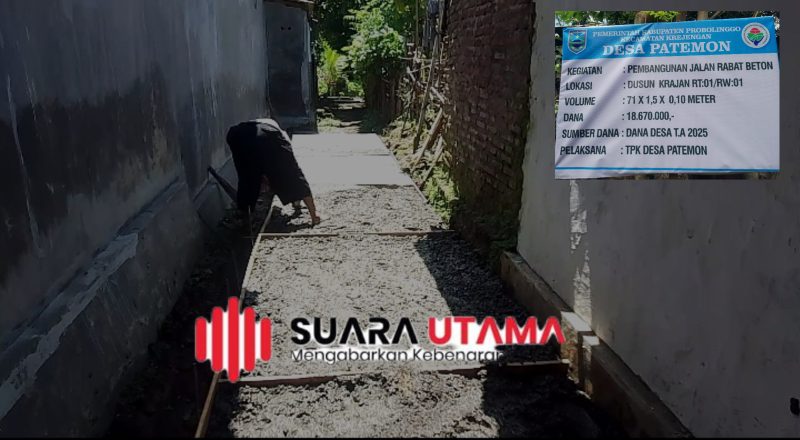 SUARA UTAMA, Probolinggo – Pemerintah Desa Patemon kecamatan Krejengan benar benar serius Membangun nya. Realisasi anggaran tahun 2025 tahap Satu, pemerintah desa patemon merealisasikan anggaran untuk pembangunan fisik infrastruktur. 22/04/2025.