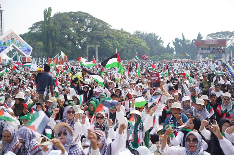 Ribuan warga dengan pakaian serba putih dan beratribut Palestina di Subang, Jawa Barat, memenuhi alun-alun Kabupaten Subang. Mereka berkumpul sejak menyingsir fajar untuk menggelar aksi bela Palestina.