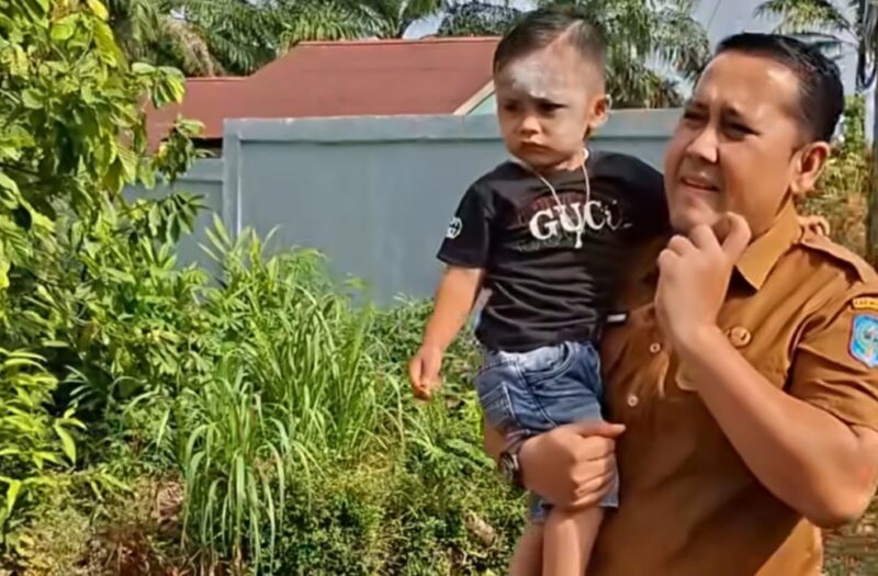 Sambil menggendong Ezel yang wajahnya masih dipenuhi bedak, Bupati berjalan menyusuri sisi jalan untuk mencari keluarga anak itu, yang tampak luput dari pengawasan.