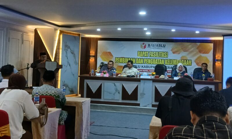 SUARA UTAMA,Merangin — Badan Pengawas Pemilu (Bawaslu) Kabupaten Merangin menggelar Rapat Fasilitasi Pembinaan dan Penguatan Kelembagaan, Senin (27/10/2025) di Merangin Hotel. Kegiatan yang dimulai pukul 09.00 WIB ini berlangsung khidmat, dihadiri oleh sejumlah perwakilan Organisasi Perangkat Daerah (OPD), pimpinan organisasi profesi, kelembagaan masyarakat, serta tokoh agama di Kabupaten Merangin.