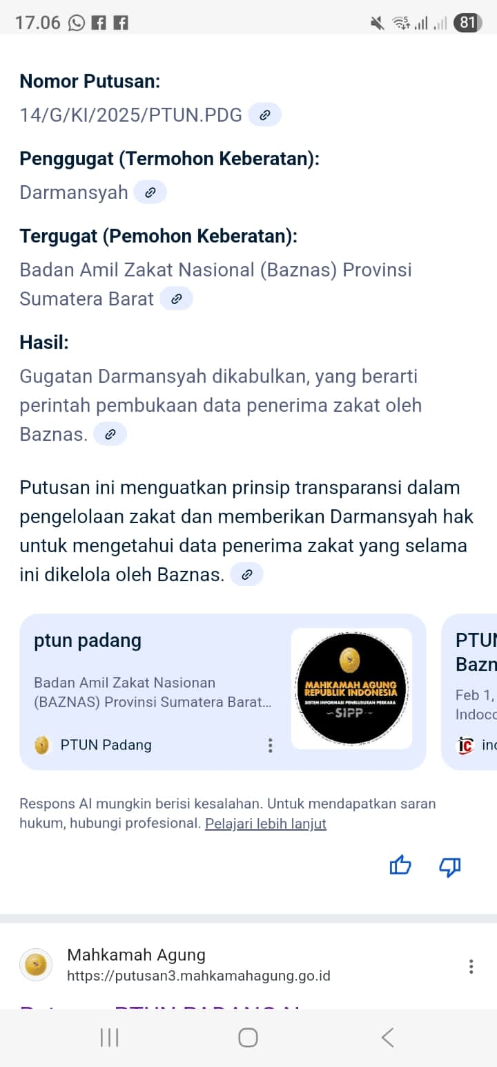 Hingga hari ini, BAZNAS Provinsi Sumatera Barat belum memberikan jawaban resmi terkait Putusan Pengadilan Tata Usaha Negara (PTUN) Padang Nomor 14/G/KI/2025/PTUN.PDG, yang memerintahkan BAZNAS Sumbar untuk membuka data penerima zakat kepada publik.