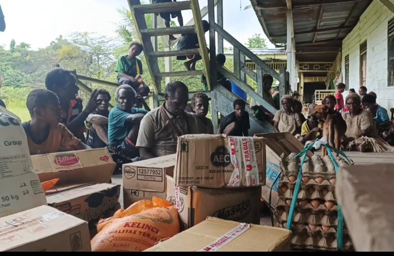 Bantuan berupa bahan makanan diangkut tiga kali menggunakan helikopter dan diserahkan langsung oleh Kepala BPBD Dogiyai, Mathias Goo, S.IP.