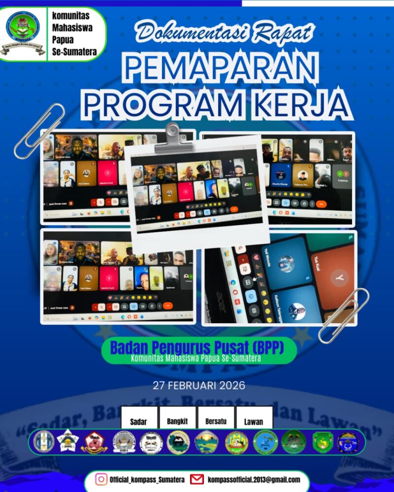 SUARAUTAMA,Dogiyai- Badan Pengurus Pusat (BPP) KOMPASS menggelar kegiatan pemaparan program kerja secara daring pada Jumat malam (27/2) pukul 19.00 WIB. Kegiatan ini diikuti oleh 45 mahasiswa Papua yang tersebar di berbagai wilayah di Pulau Sumatera.