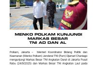 Jakarta, 29/09/2025- Dalam rangka memperkuat koordinasi pertahanan dan keamanan nasional, Menteri Koordinator Bidang Politik, Hukum, dan Keamanan (Menko Polkam) melakukan kunjungan kerja…
