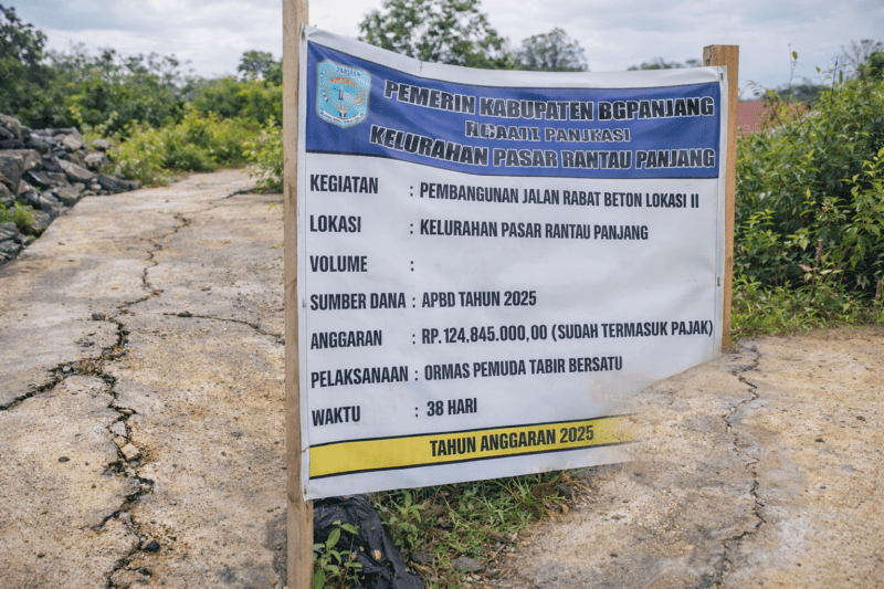 Sebagai informasi, proyek pembangunan jalan rabat beton tersebut memiliki pagu anggaran sebesar Rp124.845.000 dan berlokasi di RT 15 Kelurahan Pasar Rantau Panjang, Kecamatan Tabir.