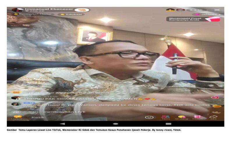 Suara Utama.- Wakil Menteri Ketenagakerjaan (Wamenaker) RI, Immanuel Ebenezer, melakukan inspeksi mendadak (sidak) yang disiarkan langsung melalui platform TikTok untuk menanggapi laporan penahanan ijazah karyawan oleh perusahaan. Salah satu sidak dilakukan di perusahaan Sanel Tour & Travel di Pekanbaru, Riau, yang diduga menahan puluhan ijazah mantan karyawan. TikTok.