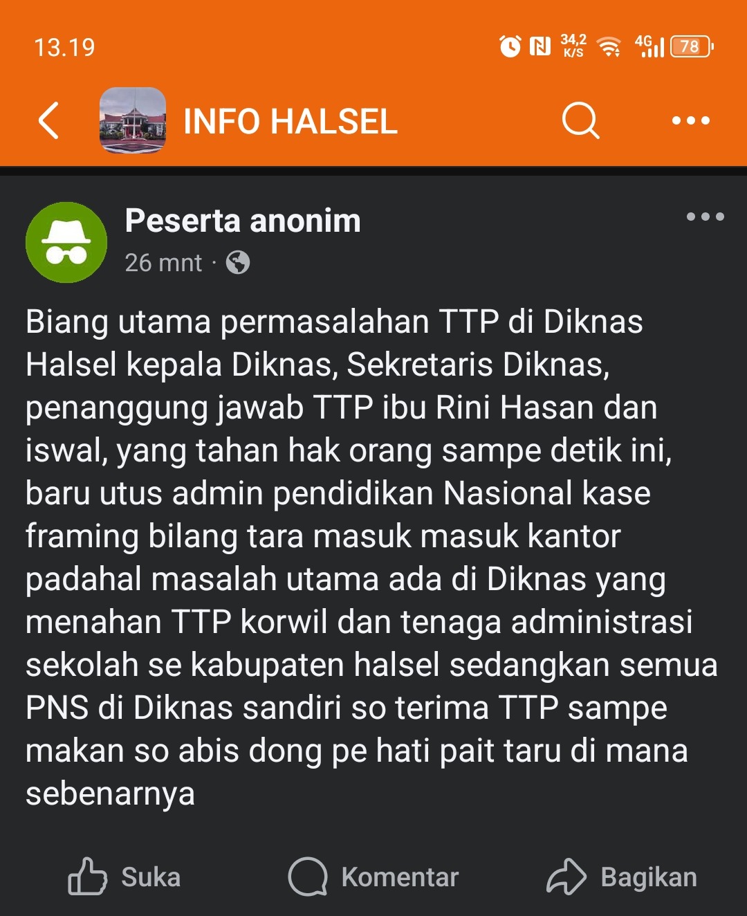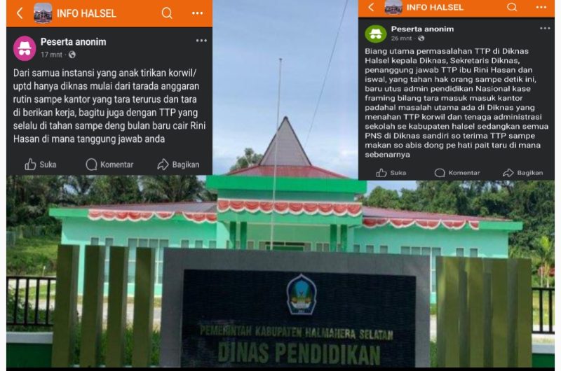 Sebuah unggahan anonim di grup Facebook Info Halsel menuding bahwa biang utama permasalahan TTP justru berada di internal Dinas Pendidikan Halsel. Dalam postingan tersebut, disebutkan sejumlah nama pejabat di Diknas, mulai dari Kepala Dinas, Sekretaris, hingga penanggung jawab TTP, Rini Hasan, dan Iswal, yang dianggap menahan hak-hak tenaga administrasi sekolah serta korwil se-Kabupaten Halsel hingga kini.