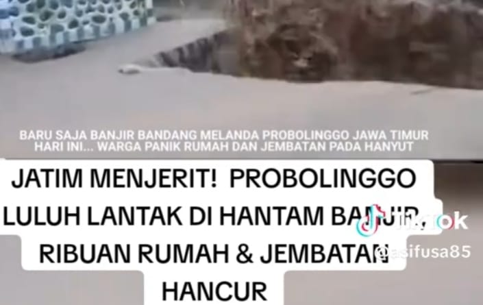 Dalam video yang di apluod pemilik akun Tiktok “Indonesia news (@asifusa85)” tertulis dengan jelas di pojok kanan atas “Jatim menjerit” sementara di pojok kiri atas “detik detik banjir runtuhkan 7 Jembatan dan puluhan rumah” selanjutnya di pojok kanan bawah “Probolinggo di hantam banjir besar dan air bak tsunami”.