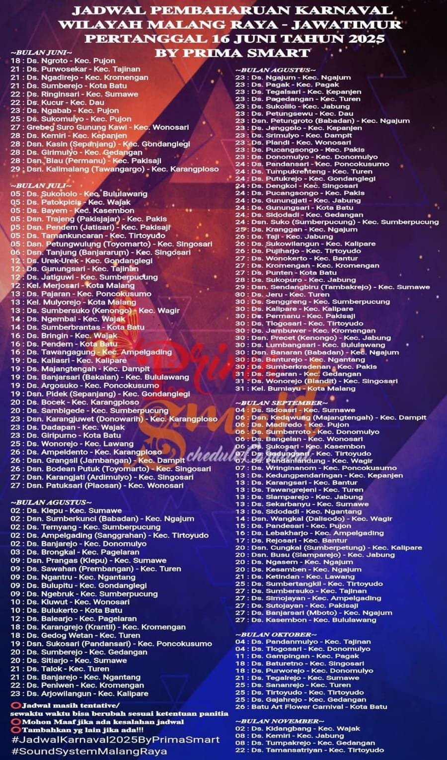 Jadwal ini dirilis oleh Prima Smart ini dan diketahui akan menampilkan berbagai atraksi budaya, tarian, dan hiburan menarik dari berbagai desa dan kecamatan di seluruh wilayah Malang Raya-Jawa Timur.