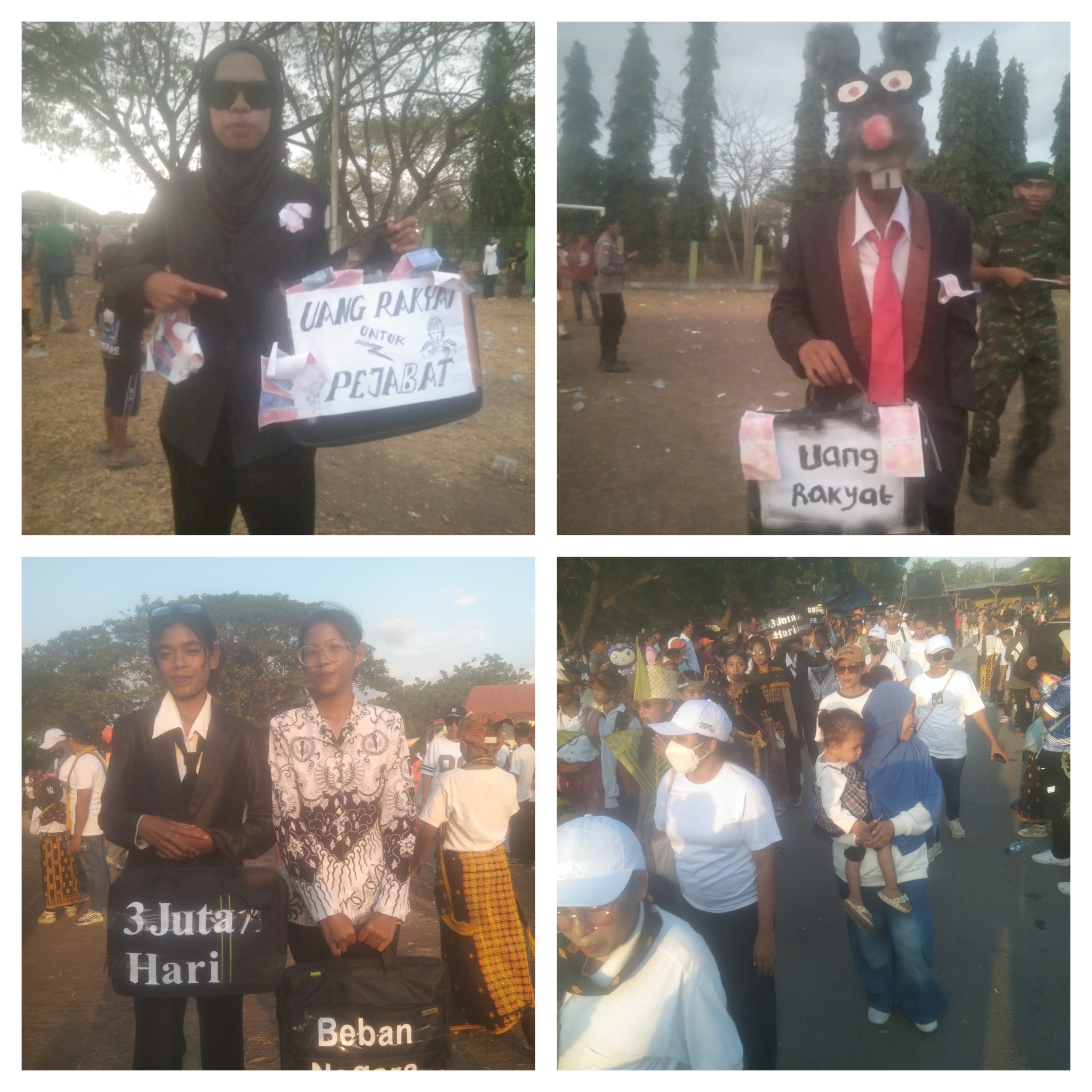 Dua pelajar tampil mengenakan setelan rapi layaknya pejabat sambil membawa koper bertuliskan “Uang Rakyat untuk Pejabat” dan “Beban Negara.” Penampilan tersebut sontak menarik perhatian penonton di sepanjang jalur parade. Banyak warga mengabadikan momen itu karena dianggap menyampaikan pesan sosial yang kuat.