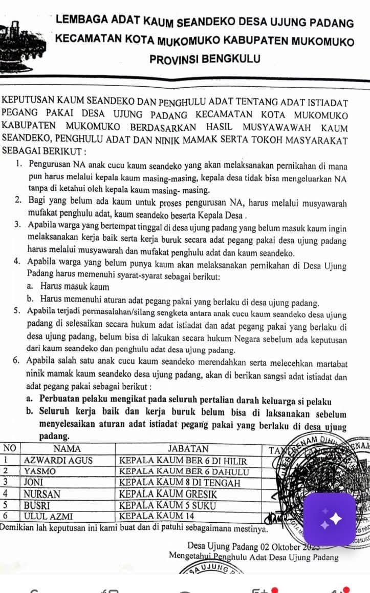 Lembaga Adat Kaum Seandeko Desa Ujung Padang, Kecamatan Kota Mukomuko, Kabupaten Mukomuko, Provinsi Bengkulu, secara resmi menetapkan keputusan adat tentang aturan dan tata tertib adat istiadat pegang pakai di wilayah adat mereka. Keputusan ini diambil melalui musyawarah bersama penghulu adat, ninik mamak, dan tokoh masyarakat Desa Ujung Padang.