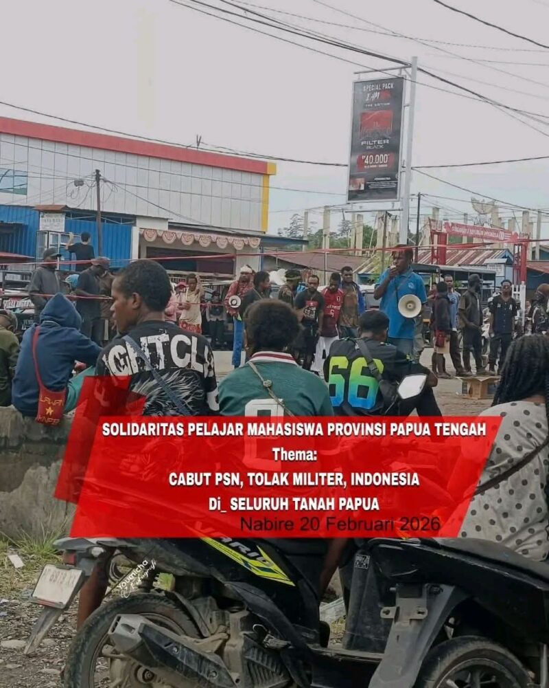 SUARAUTAMA,Nabire- Solidaritas Pelajar dan Mahasiswa Papua Tengah menggelar aksi damai mimbar bebas di Pasar Karang Tumaritis, Nabire, Papua Tengah, Jumat (20/2) pagi. Aksi dimulai pukul 08.00 WIT dan berlangsung tertib hingga selesai.