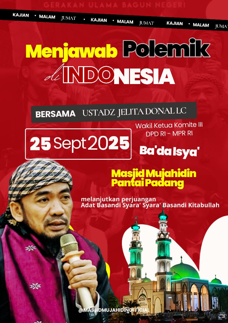 Di tengah maraknya polemik sosial, politik, dan moral yang mengemuka di Indonesia, Masjid Mujahidin Pantai Padang mengajak masyarakat untuk hadir dalam kajian istimewa bertajuk “Menjawab Polemik di Indonesia.”