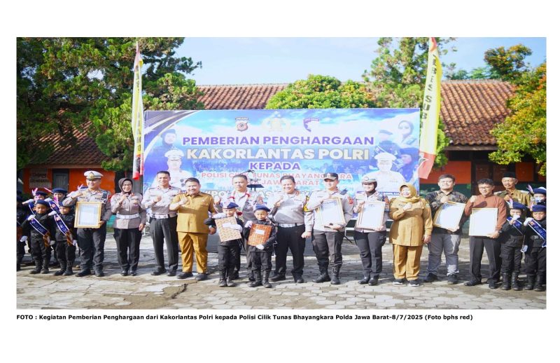 SUARA UTAMA,Subang – Kegiatan Pemberian Penghargaan dari Kakorlantas Polri kepada Polisi Cilik Tunas Bhayangkara Polda Jawa Barat yang berlangsung di SDN Kalapa Kembar Subang, pada Selasa (8/7/2025). Kegiatan ini merupakan bentuk apresiasi atas keberhasilan Polisi Cilik tampil memukau di hadapan Presiden RI dan Kapolri pada Puncak Peringatan Hari Bhayangkara ke-79 yang digelar di Lapangan Monumen Nasional (Monas), Jakarta, 1 Juli 2025 lalu. Dalam acara ini dihadiri pula Bupati Subang Bupati Subang, Reynaldy Putra Andita dan turut menyaksikan kegiatan tersebut antara lain Dirlantas dan Wadir Lantas Polda Jabar, Kapolres Subang, Kasubdit Kamsel, Kadisdik dari beberapa kabupaten/kota seperti Kota Bogor, Kabupaten Subang, Kabupaten Bandung, dan Kota Cimahi, Kasatpol PP Subang, para kepala sekolah, pelatih dan official dari Polresta Bogor, Polres Subang, Polresta Bandung, dan Polres Cimahi, serta tamu undangan lainnya.