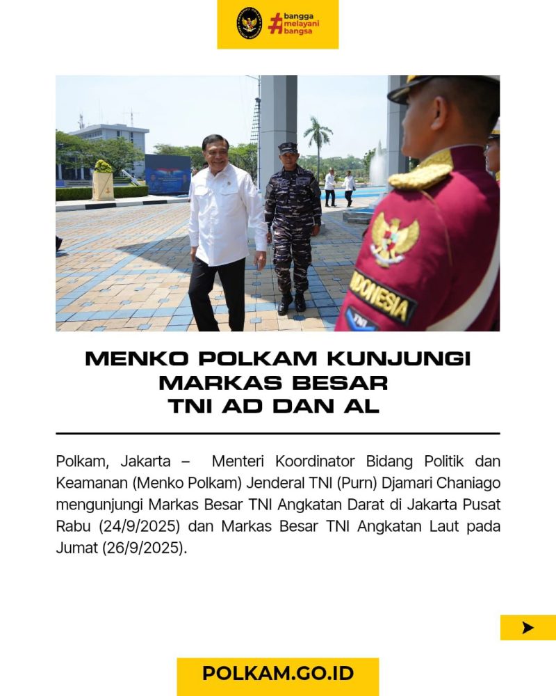 Menteri Koordinator Bidang Politik, Hukum, dan Keamanan (Menko Polkam) melakukan kunjungan kerja ke Mabes TNI Angkatan Darat (AD) dan Mabes TNI Angkatan Laut (AL).