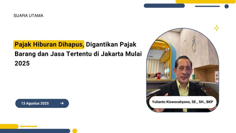 SUARA UTAMA – Jakarta, 13 Agustus 2025 – Pemerintah Provinsi DKI Jakarta memutuskan untuk menghapus Pajak Hiburan (PB1) mulai 2025 dan menggantinya dengan Pajak Barang dan Jasa Tertentu (PBJT). Kebijakan ini merupakan bagian dari reformasi sistem pajak daerah yang diharapkan lebih sesuai dengan dinamika perkembangan usaha, teknologi, dan kebutuhan fiskal ibu kota.