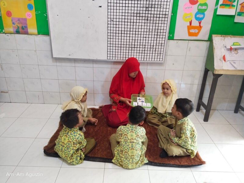 Bu Dara Solikha sedang melakukan kegiatan Peningkatan Kemampuan Bahasa Anak Melalui Media Kartu Huruf di Kelompok B TK ABA 30 Kecamatan Sepanjang Kota Sidoarjo -Semester I Tahun Ajaran 2021/2022. Foto & Gambar: Dokumentasi Pribadi Bu Dara Solikha