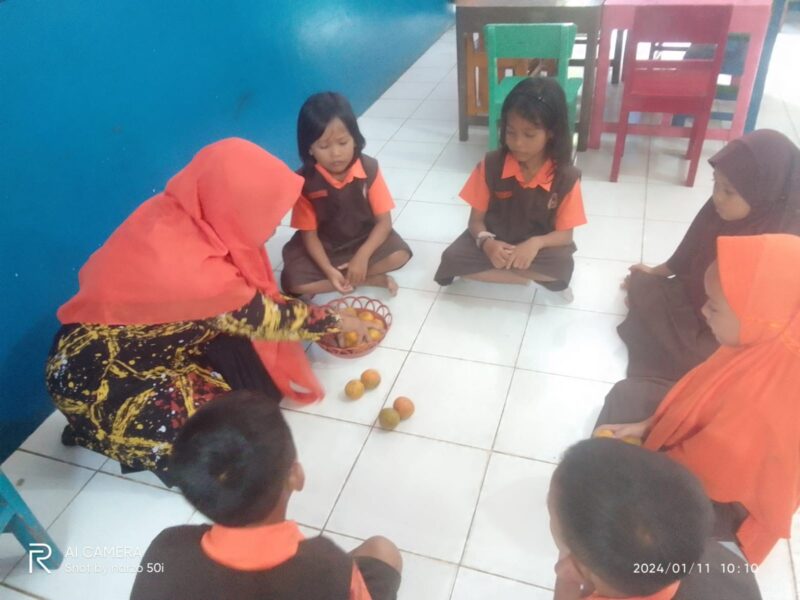 Bu Laeli Widi sedang melakukan kegiatan Peningkatan Kemampuan Menjumlah Melalui Media Aneka Buah – Buahan di Kelompok B TK PERTIWI 26-66 PAKULAUT KECAMATAN MARGASARI KABUPATEN TEGAL – Semester II Tahun Ajaran 2020/2021. Foto & Gambar: Dokumentasi Pribadi Bu Laeli Widi