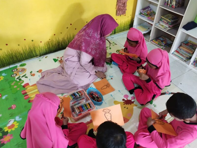 Bu Purnama sedang melakukan kegiatan Peningkatan Keterampilan Motorik Halus Melalui Kegiatan Menggunting Dengan Berbagai Media di Kelompok A TK ISLAM AL-HUDA SANGKAPURA GRESIK – Semester II Tahun Ajaran 2021/2022. Foto & Gambar: Dokumentasi Pribadi Bu Purnama