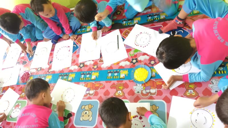 Bu Dwi Paryani sedang melakukan kegiatan Peningkatan Kreativitas Melukis Melalui Tekhnik Finger Painting di Kelompok A TK SRINGIN 02 JUMANTONO KARANGANYAR JAWA TENGAH – Semester II Tahun Ajaran 2022/2023. Foto & Gambar: Dokumentasi Pribadi Bu Paryani