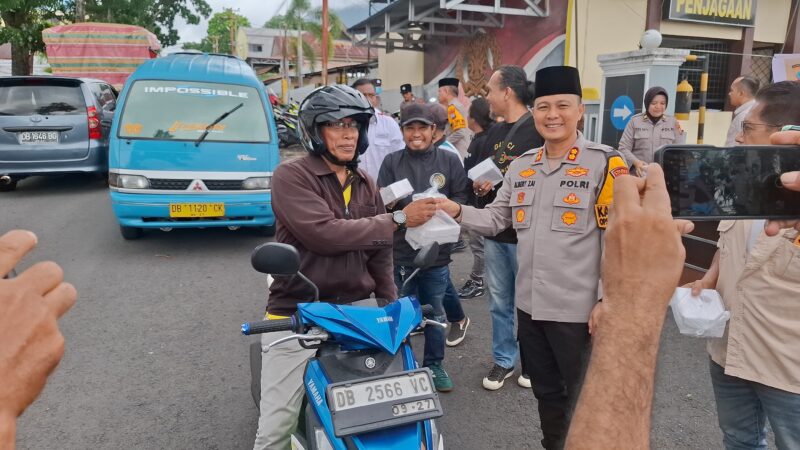 Bersama puluhan wartawan yang tergabung dalam Biro Bitung, Polres Bitung menggelar aksi sosial pembagian takjil kepada para pengguna jalan di sekitar Markas Komando Polres Bitung, Sabtu (13/3/2026).