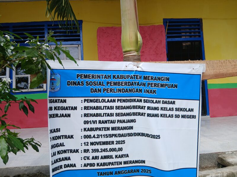 SUARA UTAMA,Merangin – Pemandangan tak biasa sekaligus memantik tanda tanya publik terpampang di SD Negeri 091 Rantau Panjang, Kabupaten Merangin. Sebuah papan informasi proyek rehabilitasi ruang kelas sekolah dasar justru mencantumkan Dinas Sosial, Pemberdayaan Perempuan dan Perlindungan Anak sebagai penanggung jawab kegiatan, padahal bangunan sekolah dasar berada di bawah naungan Dinas Pendidikan.