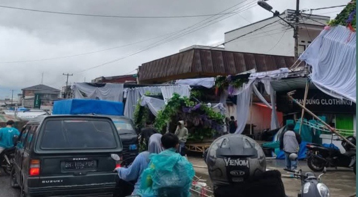 Pantauan di lokasi, puing-puing seng dan pecahan material bangunan berserakan di jalan. Sejumlah rumah kehilangan atap, kios di pasar tradisional ambruk, dan pohon tumbang menutup badan jalan. Suasana panik sempat terjadi saat warga dan pedagang berlarian menyelamatkan diri.