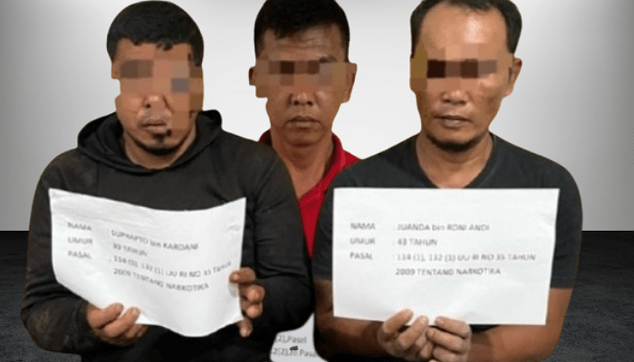 Guna mempertanggung jawabkan perbuatannya ketiga tersangka dijerat dengan Pasal 112 ayat (2), Pasal 114 ayat (2), Pasal 132 ayat (1) Undang-Undang Republik Indonesia No. 35 tahun 2009 tentang Narkotika dengan ancaman paling singkat 6 (enam) tahun dan paling lama 20 (dua puluh) tahun penjara dan pidana denda maksimum sebagaimana dimaksud pada ayat (1) ditambah 1/3 (sepertiga).
