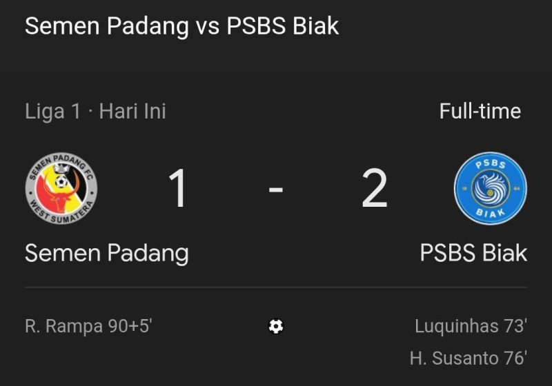 Gol Biak berhasil dicetak oleh Luquinhas menit 73′ dan H. Susanto 76′. Sementara itu gol Semen Padang Fc dicetak oleh R. Rampa menit ke-90+5′.