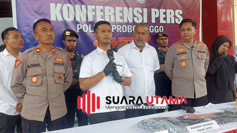 SUARA UTAMA, Probolinggo – Konferensi pers polres Probolinggo Terkait Kasus pembunuhan Seorang wanita DND Asal Desa Sumber poh kecamatan Maron. yang terjadi pada tanggal 04 April 2025 sekira jam 02 00 Wib. Dengan (Tempat kejadian perkara Desa Tarokan Kecamatan Banyuanyar Kaburr Probolinggo.