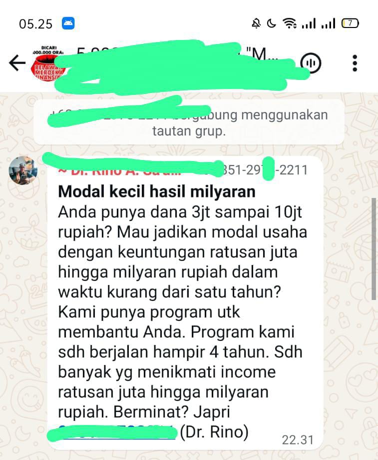 Tim investigasi media menemukan beredarnya pesan promosi yang menawarkan program investasi dengan klaim keuntungan ratusan juta hingga miliaran rupiah hanya dengan modal Rp3 juta–Rp10 juta. Dalam pesan tersebut disebutkan nama “Dr. Rino” sebagai pengelola program dan mengajak masyarakat untuk menghubungi nomor pribadi melalui WhatsApp (Japri).