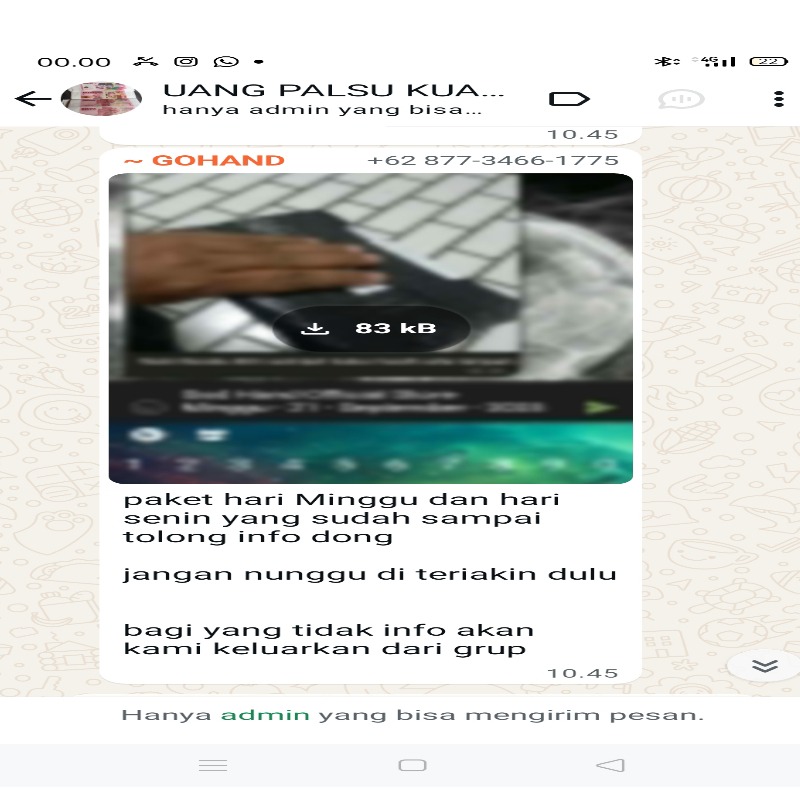 Belakangan ini beredar tangkapan layar dari sebuah grup WhatsApp bernama “UANG PALSU KU…” yang diduga menjadi sarana peredaran uang palsu. Dalam pesan tersebut, admin grup menginstruksikan anggota untuk memberikan laporan penerimaan “paket” dan mengancam akan mengeluarkan anggota yang tidak memberi informasi.